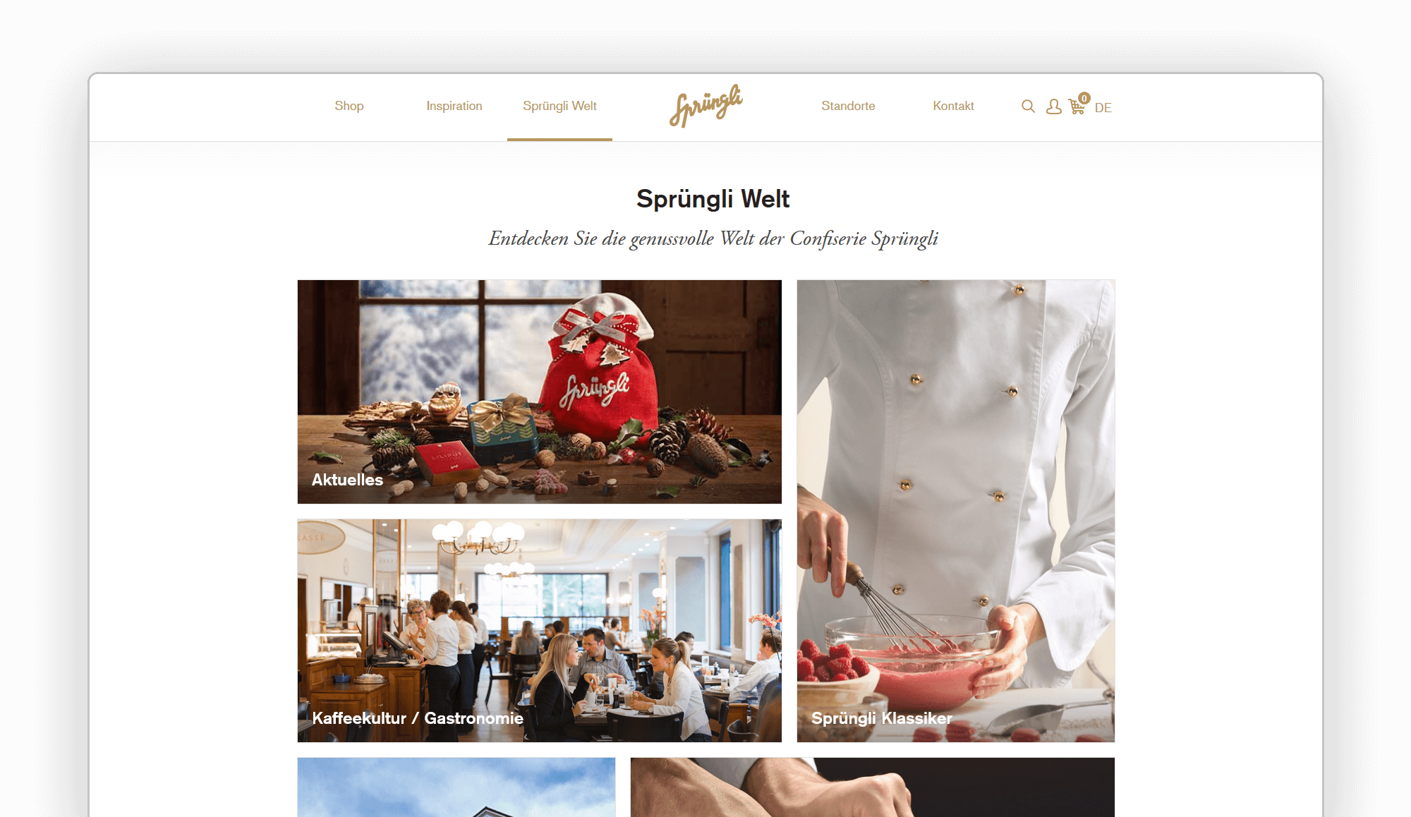 Bereits seit über 175 Jahren verwöhnt die Confiserie Sprüngli Kundinnen und Kunden weltweit mit Ihren Kreationen aus Schweizer Schokolade oder den einzigartigen Luxemburgerli. Ob im B2C- oder B2B-Segment, die weltbekannten Sprüngli-Produkte kennt einfach jeder und ist immer ein gern gesehenes Geschenk für jeden Anlass. Die Struktur der Webseite inkl. Online-Shop wurde durch die iage AG mehrsprachig aufgebaut und ist zu allen gängigen Browser und mobilen Geräten kompatibel. Der neue Webauftritt besticht durch ihre schöne Bildwelt, die richtig Lust auf die feinsten Köstlichkeiten macht! Es gibt viel zu entdecken – von den frischesten Produktneuheiten über den Business Lunch bis hin zu Geschenkideen zu diversen Anlässen.